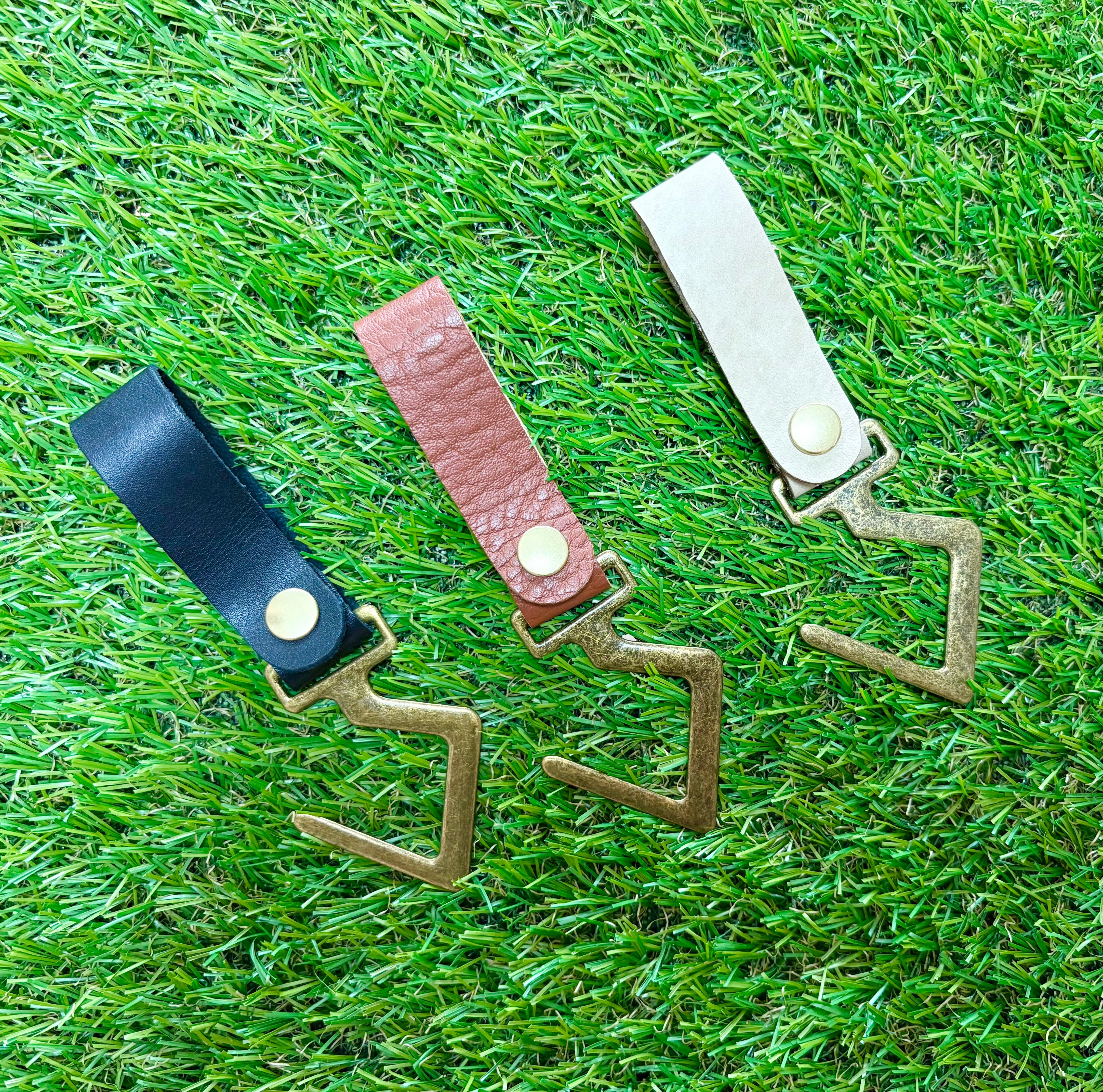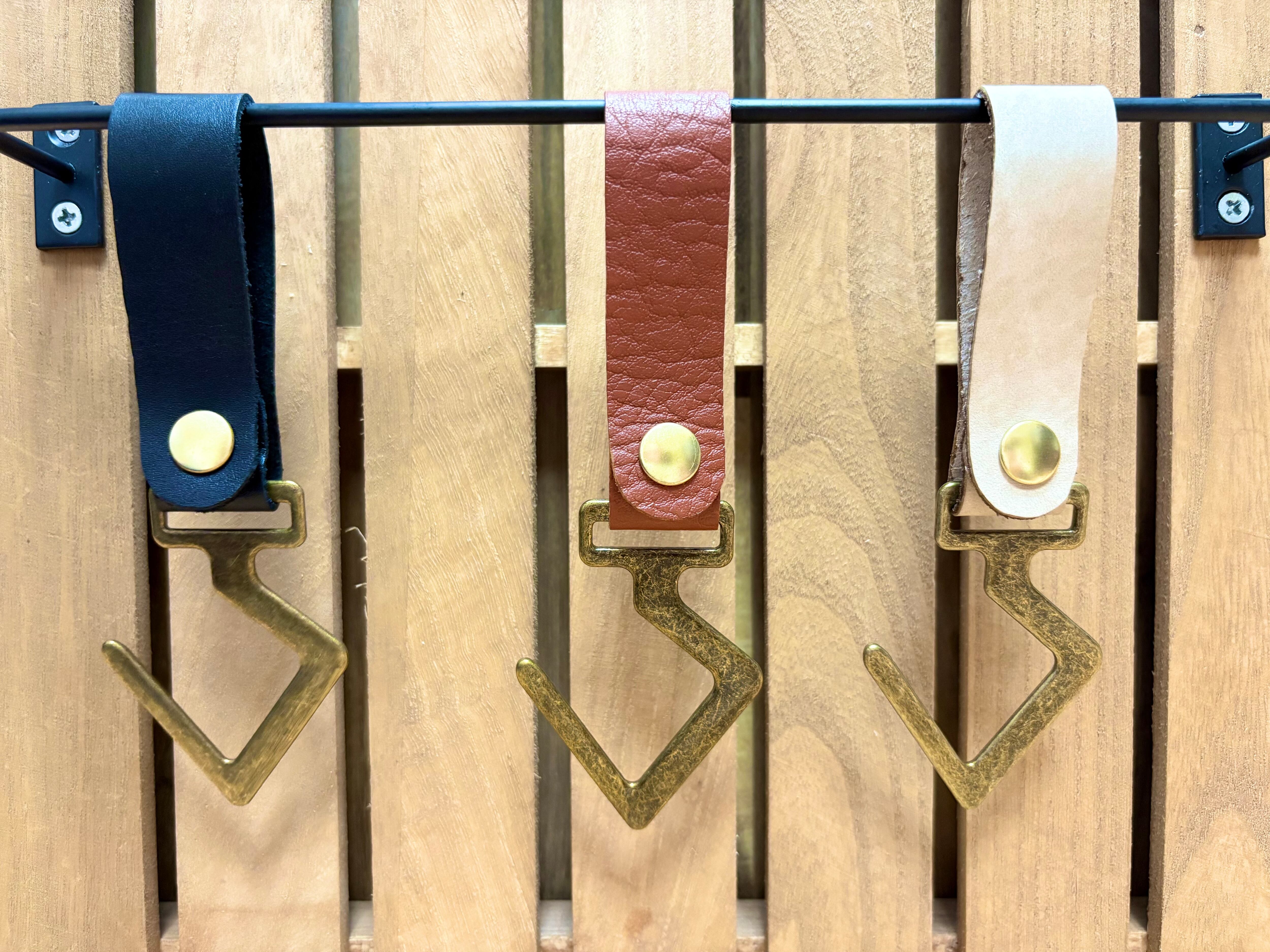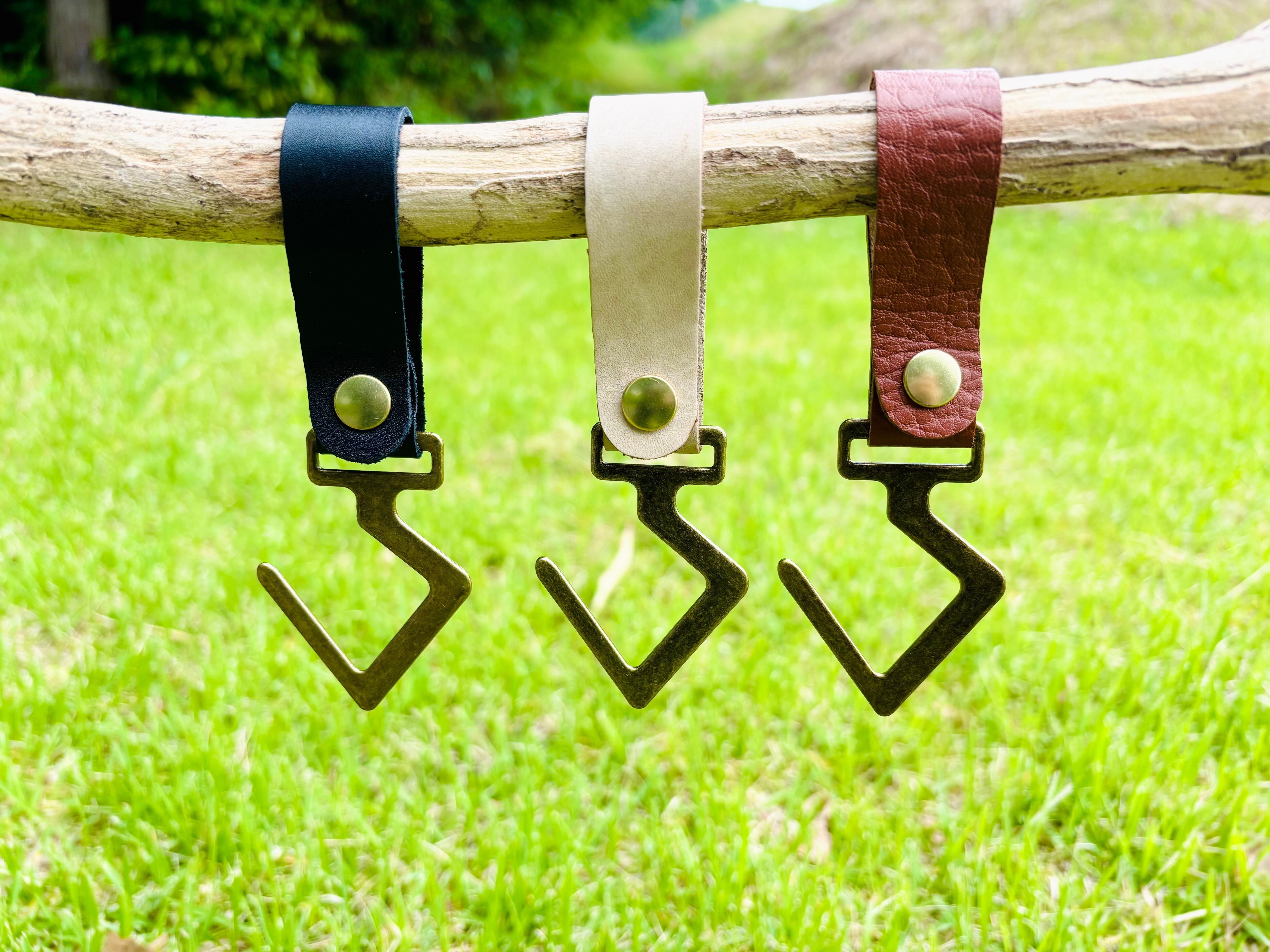 小物を掛けるのに最適なレザー製のハンギングフックです。 ボタン式で流木やポールハンガー、ハンギングラックに簡単に装着できます。 アウトドアだけでなく、部屋のインテリアにも馴染むデザインです。